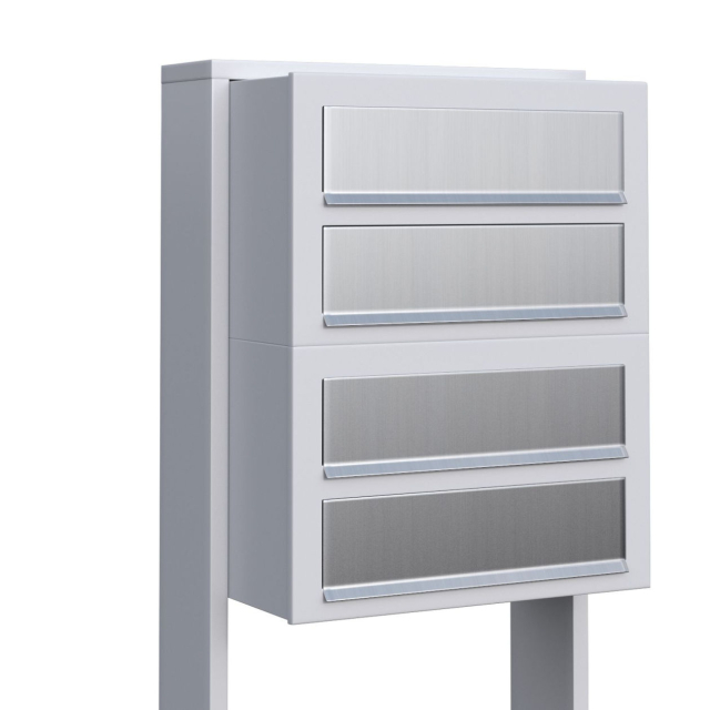 Postkastsysteem ,,Cube for Four" meervoudige brievenbusunit / postunit geschikt voor meerdere huishoudens of bedrijven. De inwerp en uitname bevinden zich onder de inwerpklep.